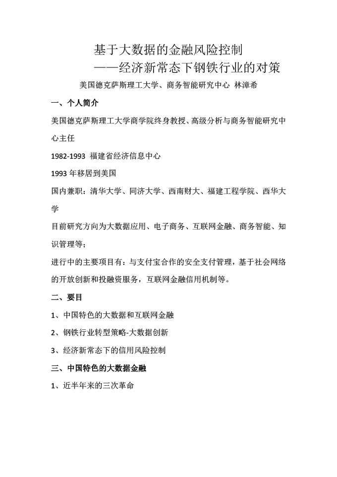 林漳希,美国德克萨斯理工大学商学院信息系统终身教授,高级分析与商务智能研究中心(CAABI)主任。信息系统博士,美国德克萨斯理工大学商学院信息系统终身教授,高级分析与商务智能研究中心(CAABI)主任。曾任福建省经济信息中心副主任(正处级),高级工程师,福建省经济信息办公室副主任。2007-2013聘为西南财经大学经济信息工程学院海外院长,2008-2015兼任四川省金融智能与金融工程重点实验室主任。清华大学Austin校友会主要发起人(1997),清华大学大数据产业联合会发起人之一(2014年)。