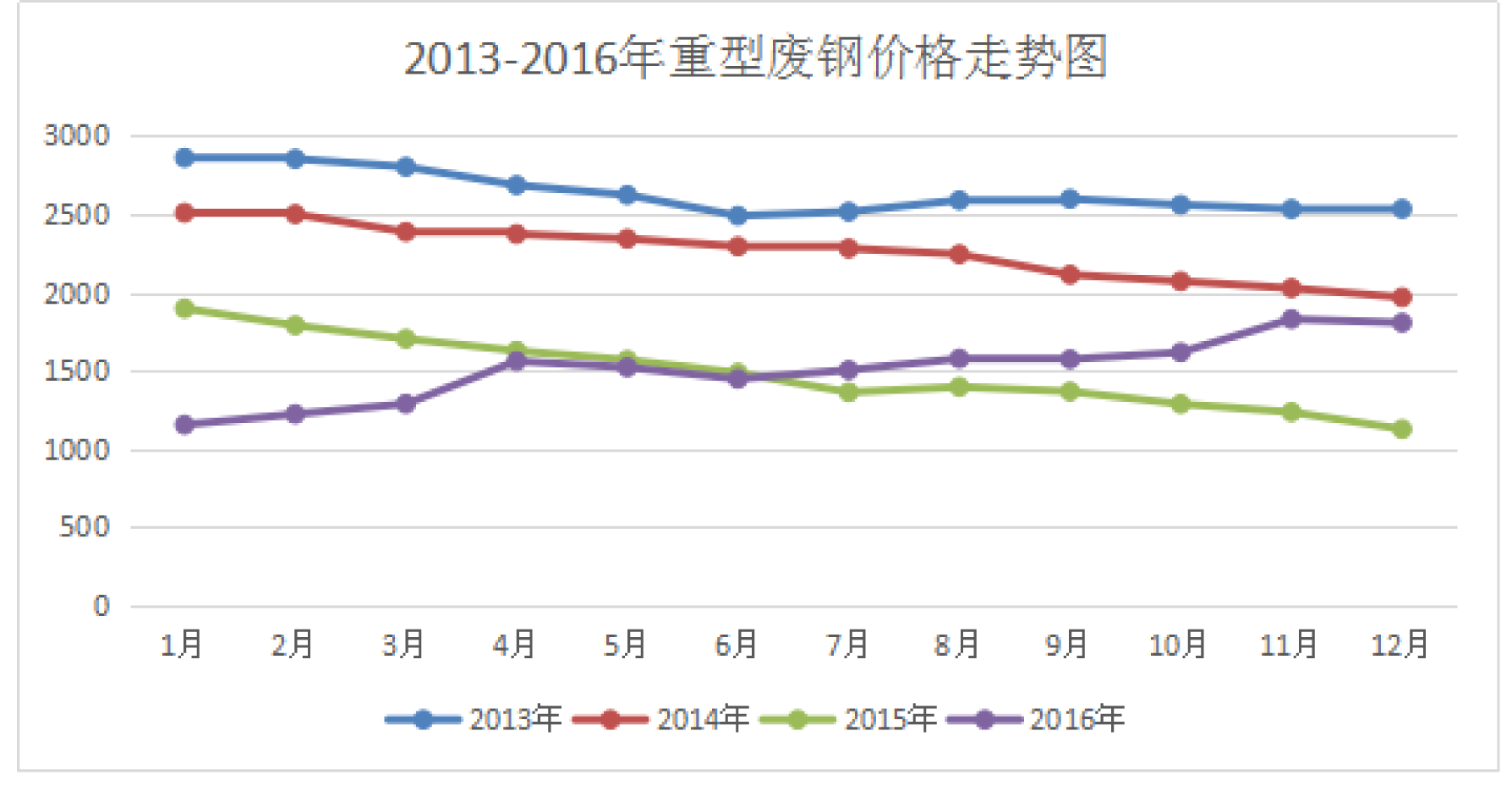 废钢铁市场价格从年初一路上涨,平均价格比2015年同期平均上涨400-500元,最高价格比最低价格上涨一倍之多。特别是下半年由于煤炭价格翻倍上涨,造成了铁水成本不断攀升,钢铁企业不断增加废钢铁的使用量,许多钢企都在抢购重型废钢,把多用废钢铁做为节铁增钢节能减排的有力措施。以重型废钢为例,2016年1月份1153元/吨。四季度平均价格1750元/吨,与2015年同比上涨了560元/吨,涨幅32%。